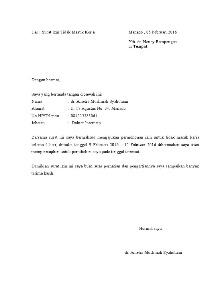 Tentu saja, anda perlu mendapatkan izin dari atasan atau hrd untuk bisa meninggalkan pekerjaan sementara waktu. Meski tiap perusahaan, instansi, dan tempat . Download surat izin tidak masuk kerja format.doc. Dengan ini memohon izin untuk tidak masuk kerja pada hari ini,. Bersama ini kami sampaikan bahwa saya :.